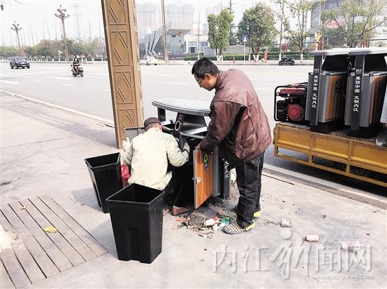 曹師傅和李師傅正在更換被燒毀的垃圾箱